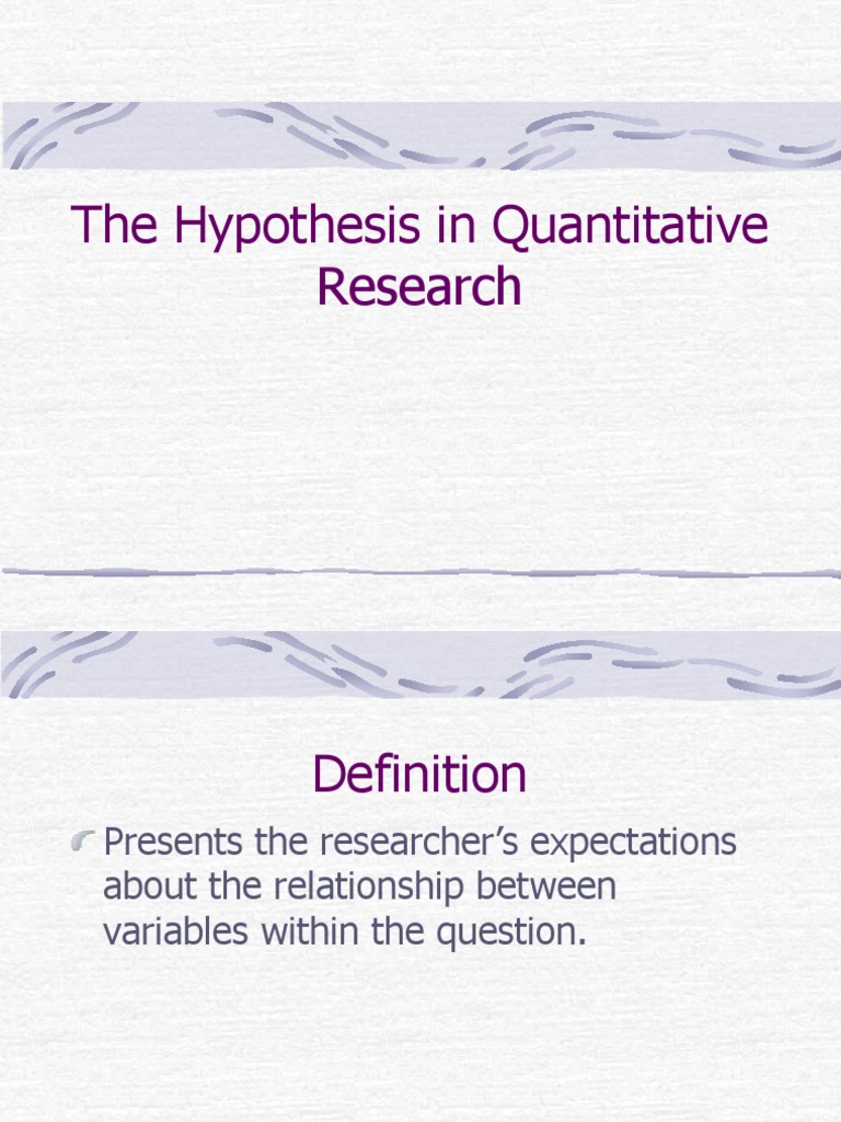 For example, the third research question above can be made into the hypothesis: A researcher has prior knowledge about correlations among the null hypothesis is always presented in the following form: Hypotheses are the testable statements linked to your research question. Quantitative research is explaining phenomena by collecting numerical data that are analysed qualitative research seeks to answer questions about why and how people behave in the way that they do. While these efforts involved analysis of chapter 3 methodology this research used hypothesis testing to collect data that signified a relationship between dependent and independent.