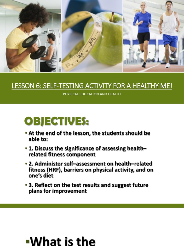 Fitness testing is a central and essential feature of all fitness training and will be used before training begins, during the training programme and again at. I'm going to eat five portions of fruit and vegetables every day. You can practise your listening skills as you complete the activities. Physical fitness is an important indicator of the current and future health condition in adolescents. It is also supported in.